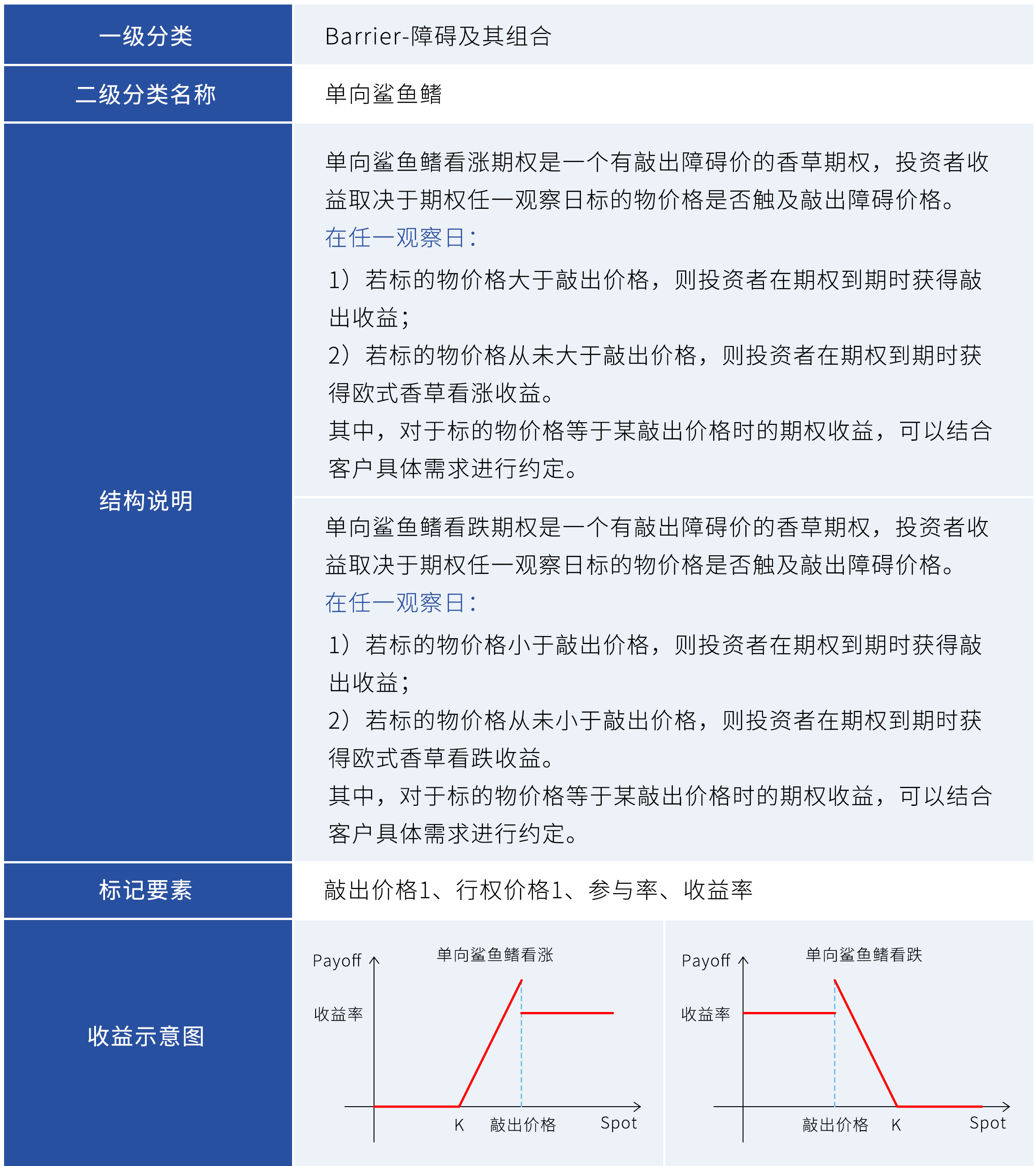 障碍期权分为敲出障碍期权和敲入障碍期权。敲出障碍期权通常指当标的在存续期内从未触碰一个特定的障碍价时,在期末获得等价于香草期权的收益,否则获得固定收益的期权结构。敲入障碍期权通常指当标的在存续期内从未触碰一个特定的障碍价时,在期末获得固定收益,否则在期末获得等价于香草期权的收益的期权结构。