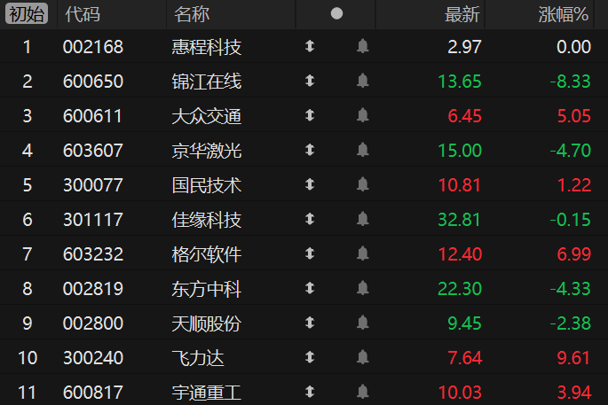 【竞价看龙头】财联社7月23日电,市场焦点股惠程科技 (4板)平开,网约车概念股锦江在线 (10天7板)低开8.33%、大众交通(9天5板)高开5.05%,芯片产业链的京华激光(3板)低开4.70%、国民技术(创业板首板)高开1.22%,信创板块佳缘科技(创业板2板)低开0.15%、格尔软件(2板)高开6.99%、东方中科(2板)低开4.33%,物流板块天顺股份(2板)低开2.38%、飞力达(创业板首板)高开9.61%,智能驾驶概念股宇通重工(2板)高开3.94%。