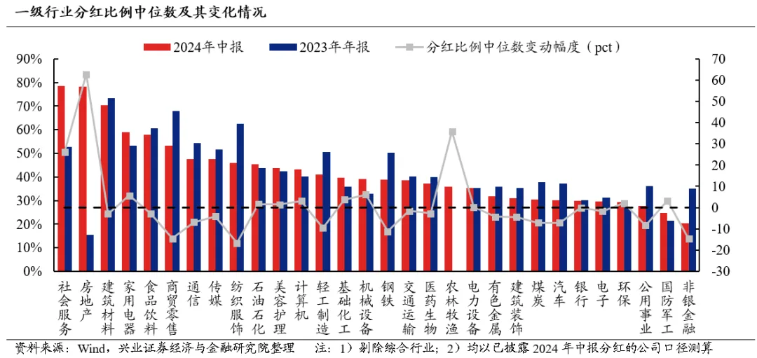 一级行业来看,消费品板块的分红比例普遍较高,而地产链部分公司也在中报进行了高比例分红。将一级行业按照2024年中报分红比例中位数降序排列,社会服务(78.61%)、房地产(78.29%)、建筑材料(70.23%)家用电器(58.90%)、食品饮料(57.79%)位列前五。