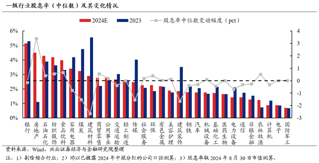 一级行业股息率中位数来看,以2024年中报分红*2/最新市值测算2024E股息率(后文同),银行(5.15%)是2024E股息率最高的行业,房地产(4.50%)、石油石化(4.29%)、纺织服饰(4.19%)次之。动态来看,房地产(+3.39pct)、食品饮料(+0.67pct)、商贸零售(+0.56pct)行业的2024E股息率较2023年出现明显改善,而建筑材料(-2.65pct)和建筑装饰(-1.66pct)板块2024E股息率则显著下滑。