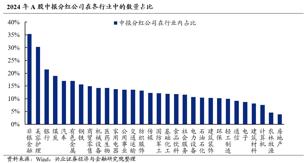 动态来看,房地产(+62.77pct)、农林牧渔(+35.84pct)2024年中报分红比例中位数较2023年年报出现大幅改善,部分原因在于基本面企稳,但也存在中报分红样本量较少,个别公司扰动较大的影响。此外,社会服务(+26.01pct)、机械设备(+6.10pct)、家用电器(+5.74pct)2024年中报分红比例较2023年年报也出现好转。