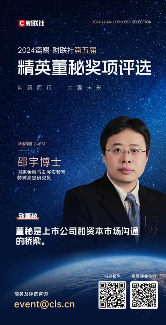 本期将为您介绍2024鸾鹭•财联社第五届精英董秘评选的特邀评委——国家金融与发展实验室特聘高级研究员,邵宇。