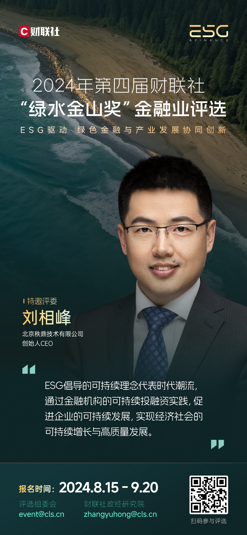 本期将为您介绍2024年第四届财联社“绿水金山奖”金融业评选特邀评委——北京秩鼎技术有限公司创始人CEO,刘相峰。