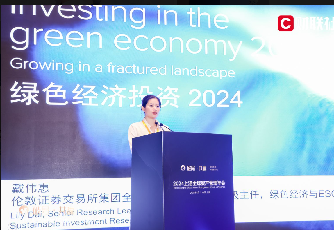 财联社9月21日讯9月20日,由上海报业集团指导,财联社、上海陆家嘴管理局联合主办的“2024上海全球资产管理年会”成功召开。伦敦证券交易所集团绿色经济与ESG首席分析师戴伟惠发表了主旨演讲《绿色经济投资2024》。