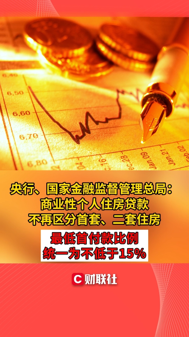 【CC新闻】央行、国家金融监督管理总局:商业性个人住房贷款不再区分首套、二套住房 最低首付款比例统一为不低于15%