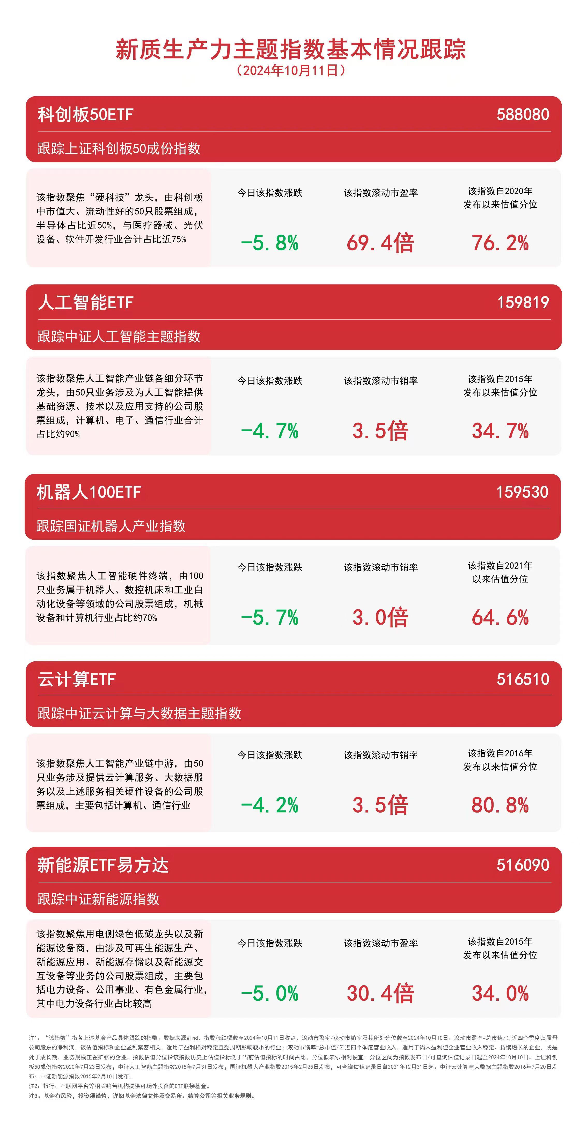 【新质生产力主题指数全天弱势,云计算ETF(516510)、新能源ETF易方达(516090)等产品布局未来产业】财联社10月11日电,截至收盘,今日中证云计算与大数据主题指数下跌4.2%,中证人工智能主题指数下跌4.7%,中证新能源指数下跌5.0%,国证机器人产业指数下跌5.7%,上证科创板50成份指数下跌5.8%。