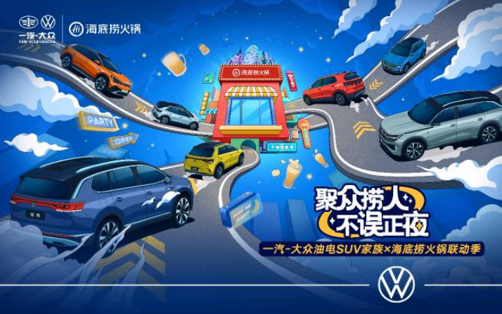 10月30日, 一汽-大众油电SUV家族和海底捞火锅官宣合作“搞事情”,共同打造了主题为“聚众捞人 不误正夜”的一系列联动事件。除了推出联名套餐,双方还在上海打造了商圈主题店和露营快闪活动,参与体验互动不仅能获得有趣的周边礼品,更有机会抽取一汽-大众SUV一年使用权等大奖。