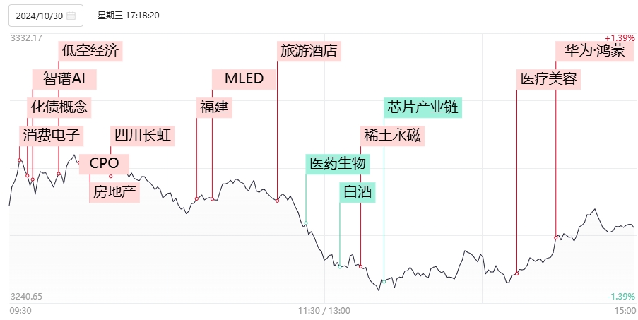 【昨日行情回顾】财联社10月31日电,市场全天探底回升,创业板指领跌。整体上个股跌多涨少,全市场超2900只个股下跌。沪深两市全天成交额1.85万亿,较前日缩量2155亿。1)《科创板日报》记者从供应链相关人士处获悉, 11月部分华为Mate 70零部件的计划投产数相较Mate60同期增加约50%。消费电子产业链持续站上风口,欧菲光、华映科技、福日电子实现连板晋级,进而带动面板股星星科技、TCL科技涨停。2)在日前成都举行的2024(第七届)中国航空科学技术大会上,发布了《2024低空经济场景白皮书》,低空经济概念持续站上风口,中化岩土、上工申贝、建新股份等十余股封死涨停。3)据蓝鲸新闻报道,有市场消息称,自29日起,隆基绿能光伏组件价格上涨1-2分/瓦,截至目前,包括天合光能、晶科、通威、晶澳在内头部组件企业出货价格均已向上微调1-3分/瓦。但光伏板块全天仍然表现出分化行情,包括TCL中环等公司发布的第三季度业绩仍出现不同程度大额亏损,可见整个光伏行业仍呈现出强预期弱现实的状态。4)此前受到深圳提出大力发展创投资本并大胆试错利好的深圳本地以及创投概念股,除去深康佳A外,包括大众公用、力合科创等纷纷走出巨量分歧。在并购重组持续升温,有望有效打通一二级市场间的原有瓶颈背景下,一些持有大量创投公司以及优质一级市场股权项目的优质创投个股仍有待价值重估。