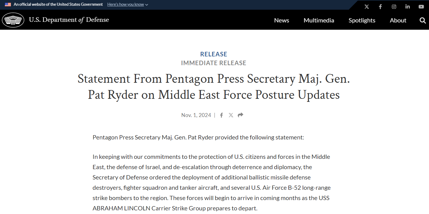 五角大楼新闻秘书帕特-莱德少将在一份声明中表示,奥斯汀下令向中东地区增派弹道导弹防御驱逐舰、一支战斗机中队和空中加油机,以及几架空军B-52远程打击轰炸机。