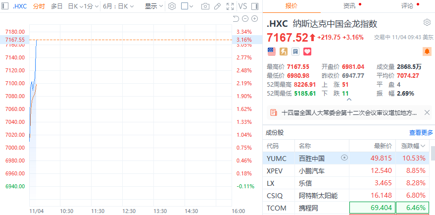 【纳斯达克中国金龙指数日内涨幅扩大至3%】财联社11月4日电,纳斯达克中国金龙指数日内涨幅扩大至3%。百胜中国涨超10%,小鹏汽车、乐信涨超8%,携程网涨超6%。