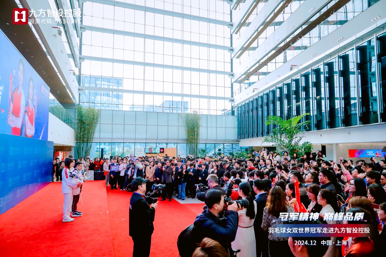 12月27日下午,贾一凡和陈清晨一踏入九方智投控股大楼,便被热烈的掌声和欢呼声包围。几位活泼可爱的小朋友向冠军大姐姐献上鲜花和卡通抱枕,现场气氛瞬间被点燃。九方智投控股创始人、董事会主席兼CEO陈文彬发表了热情洋溢的欢迎词。他表示,冠军们在赛场上展现出的拼搏精神和巅峰品质,不仅树立了榜样,更激励着人们在各自的行业中不断追求卓越。