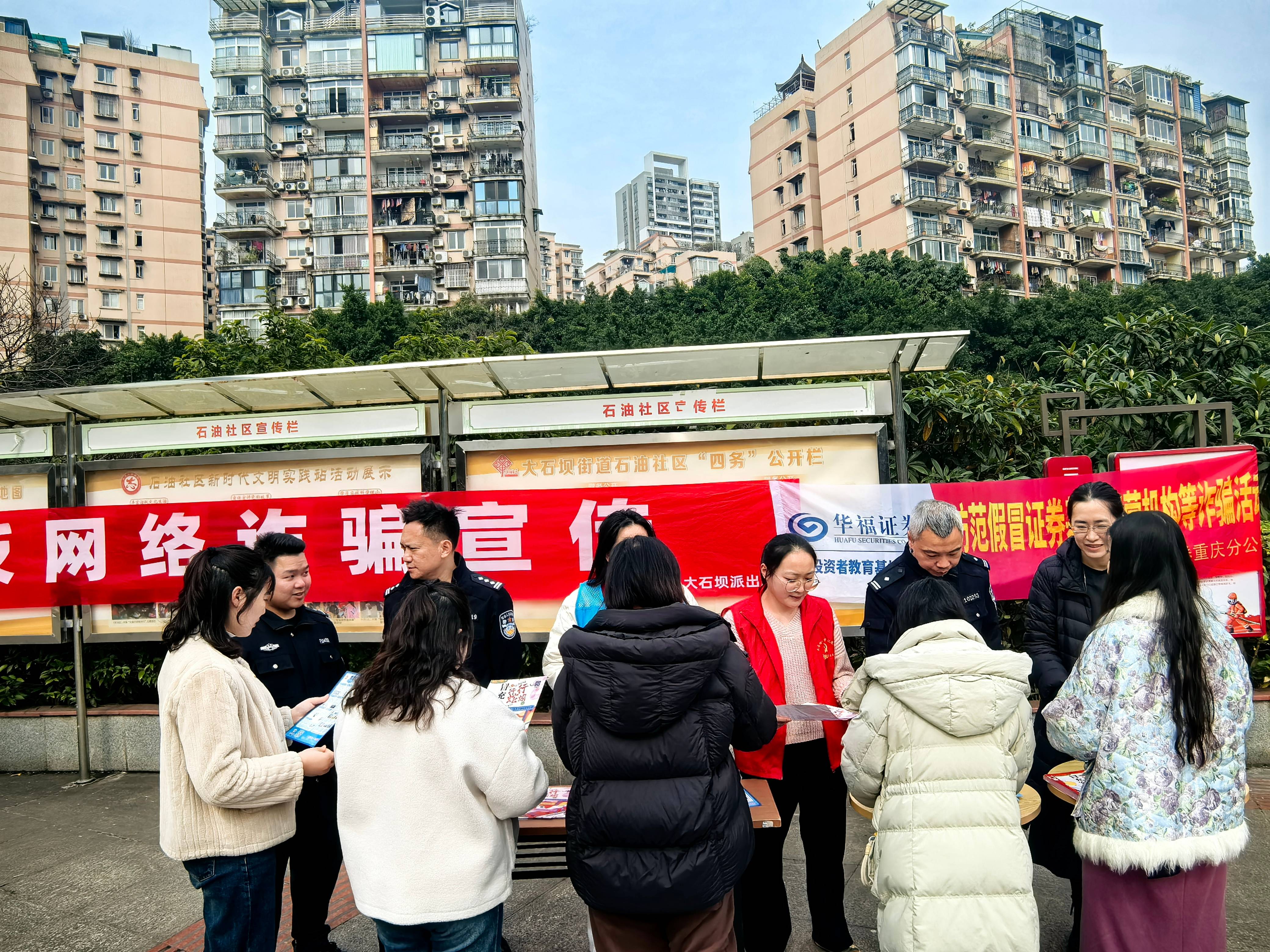 近期各类诈骗活动层出不穷,尤其是针对老年人的金融诈骗案件频发。为有效防范此类诈骗活动,保障社区居民的财产安全,提升社区居民的金融素养和风险防范意识,2025年2月28日下午,华福证券重庆分公司联合江北区大石坝派出所及石油路社区工作人员,在江北区大石坝石油路社区文化广场成功举办了一场以“防范假冒证券基金经营机构等诈骗活动”为主题的投资者教育活动。