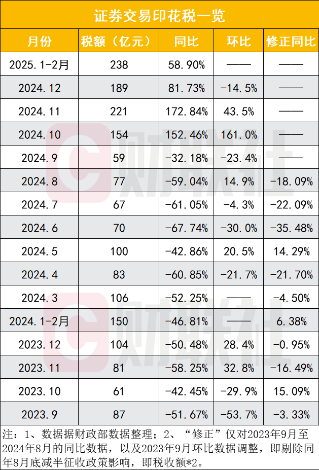 上述同比增幅,远远超过了去年同期经调整后的证券交易印花税增幅。2024年前两个月,证券交易印花税经调同比增幅仅为6.38%。这里的经调数据,是剔除了“减半征收证券交易印花税”影响后的表现。