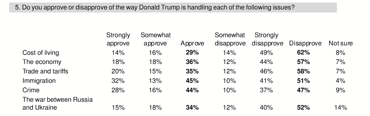 调查结果显示,特朗普在“生活成本”问题的支持率已经降低谷底,只有29%,不支持率高达62%,这一支持率表现是包括经济、移民、犯罪等所有主要议题中支持率最低的。