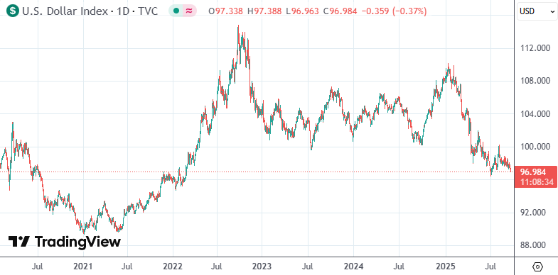 日内,美元指数一度跌破97关口,最低时报96.96,为7月7日以来最低。