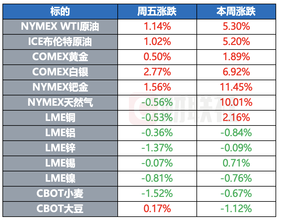 COMEX黄金期货收涨0.5%,报3789.8美元/盎司,本周累计上涨1.89%;COMEX白银期货收涨2.77%,报46.365美元/盎司,本周累计上涨6.92%。