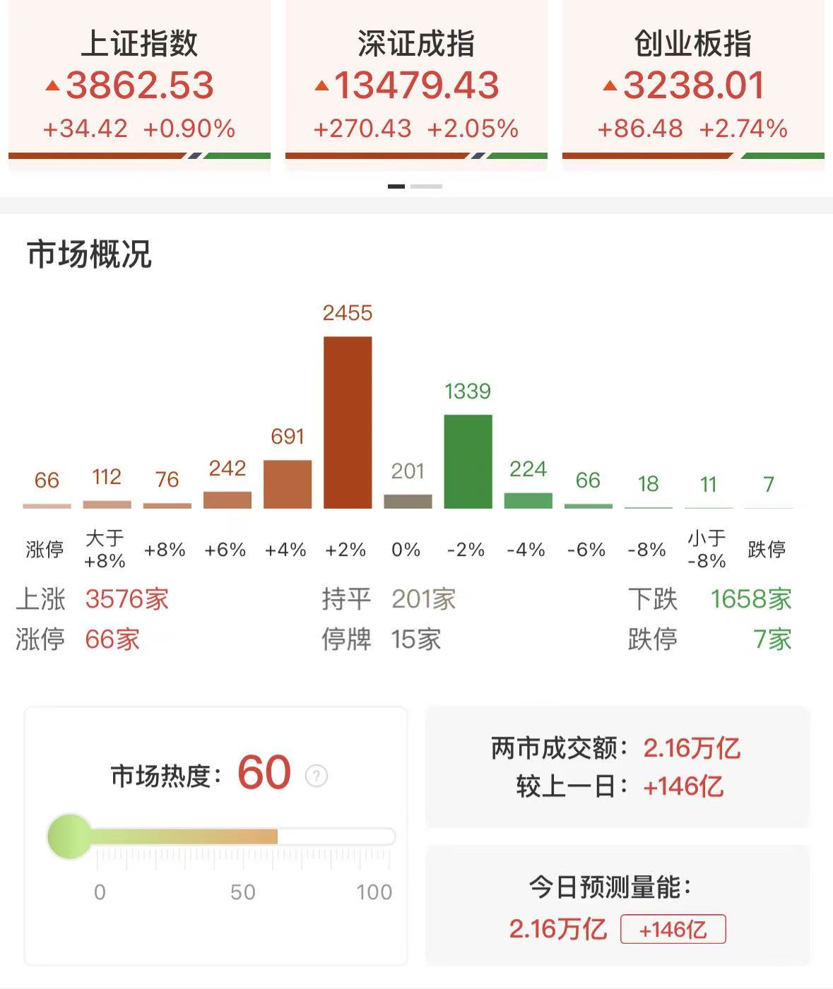 财联社9月29日讯,市场全天震荡走强,三大指数集体上涨。沪深两市成交额2.16万亿,较上一个交易日放量146亿。盘面上,市场热点快速轮动,全市场超3500只个股上涨。从板块来看,大金融板块集体爆发,国盛金控涨停创新高,广发证券、华泰证券双双涨停。新能源板块走强,其中绿色甲醇概念股表现活跃,东华科技2连板,佛燃能源首板涨停。储能概念股反弹,通润装备4天2板。此外半导体产业链午后回暖,长川科技大涨续创历史新高。下跌方面,教育股全天走弱,凯文教育、中国高科双双触及跌停。截至收盘,沪指涨0.90%,深成指涨2.05%,创业板指涨2.74%
