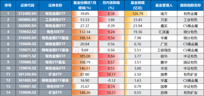 其余有色金属相关的股票型ETF方面,规模超10亿元的工业有色ETF(560860)、稀有金属ETF(562800)、有色50ETF(159652)近1个月份额分别增长53.3%、27.4%、112.3%。此外,基金规模较小的有色金属系ETF中,有色金属ETF基金(516650)、有色金属ETF(159871)、矿业ETF(159690)、有色龙头ETF(159876)近1个月份额获得翻倍。