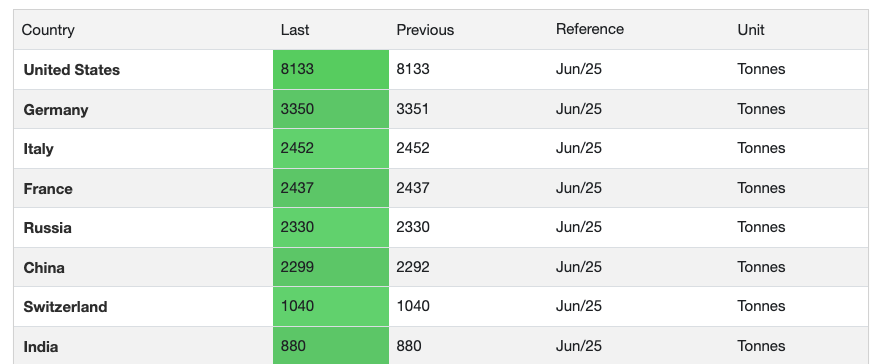 (全球国家黄金储备,来源:tradingeconomics)