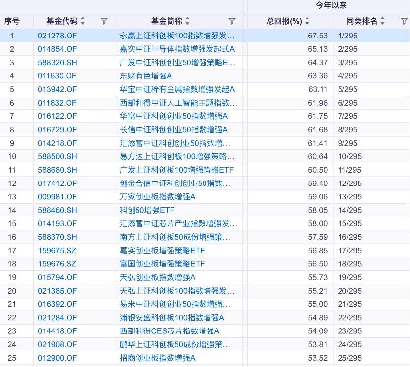 增强基金冠军来自永赢上证科创板100指数增强,年内回报率67.53%,嘉实中证半导体指数增强回报率65.13%,排名第二,广发中证科创创业50增强策略ETF排名第三,回报率为64.37%。