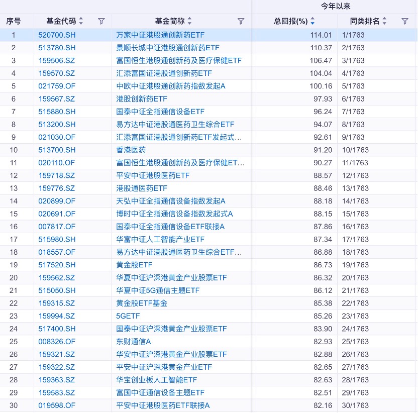 收益排名前十的还有银华港股创新药ETF、国泰中证全指通信设备ETF、易方达中证港股通医药卫生综合ETF、鹏华香港医药以及平安中证港股医药ETF,前十收益率超88%。