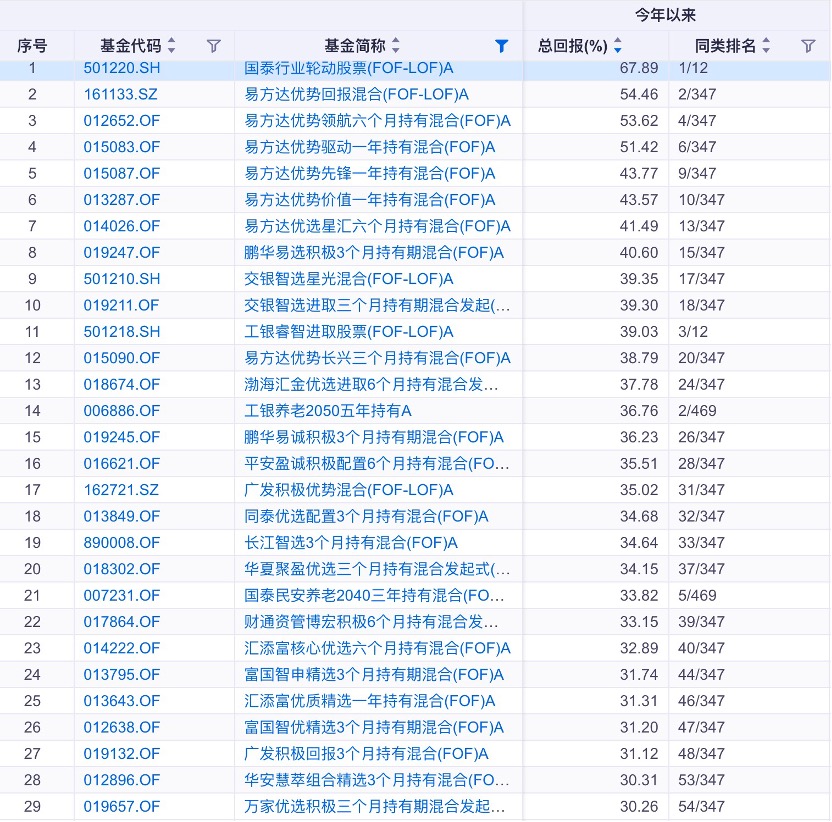 29只FOF年内回报率超30%