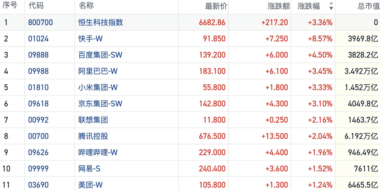 盘面上,大型科网股表现强势,快手大涨逾8%,阿里巴巴、百度、小米、京东均涨超3%,腾讯、网易、美团等公司也集体飘红。
