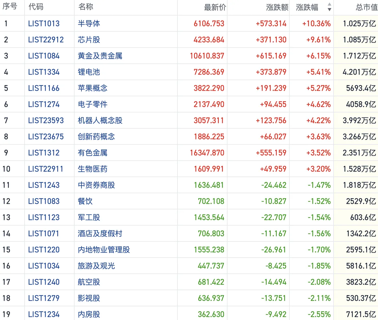 其他方向上,黄金有色、锂电、半导体股延续近期强势。汽车、生物医药等热点也集体跟涨。而下跌的板块中,地产、券商、航运等板块相对弱势。
