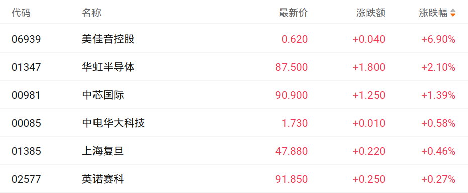 截至收盘,华虹半导体(01347.HK)、中芯国际(00981.HK)、上海复旦(01385.HK)分别上涨2.10%、1.39%、0.46%。