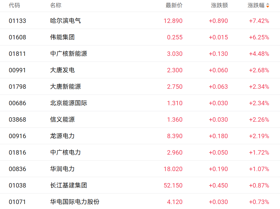截至收盘,哈尔滨电气(01133.HK)、中广核新能源(01811.HK)、大唐发电(00991.HK)分别上涨7.42%、4.48%、2.68%。