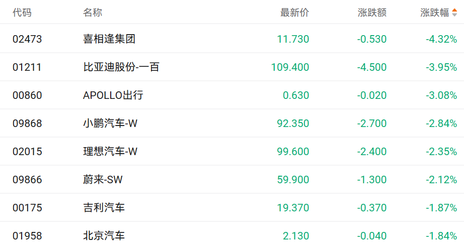 截至收盘,比亚迪股份(01211.HK)、小鹏汽车-W(09868.HK)、理想汽车-W(02015.HK)分别下跌3.95%、2.84%、2.35%。