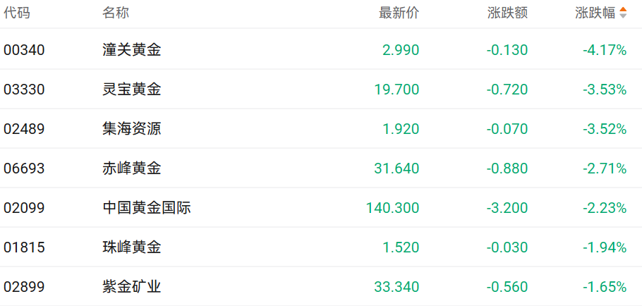 截至收盘,潼关黄金(00340.HK)、灵宝黄金(03330.HK)、中国黄金国际(02099.HK)分别下跌4.17%、3.53%、2.23%。