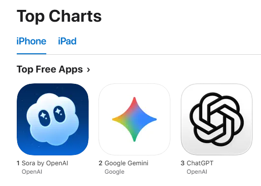 财联社10月3日讯(编辑 赵昊)当地时间周五(10月3日),OpenAI周二推出的视频社交应用Sora登顶苹果美国“热门免费应用”(Top Free Apps)榜单。