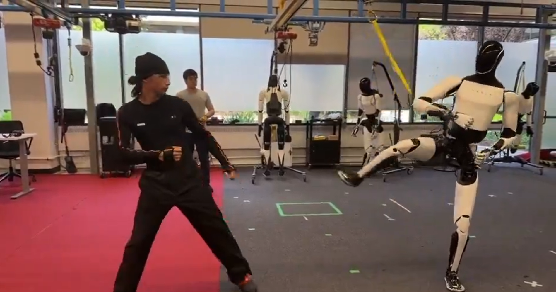 近日,埃隆·马斯克在社交平台X上传了一段特斯拉机器人Optimus和人类工作人员“过招”练功夫的视频。视频中,Optimus的背部系有一根牵引绳,除此之外并无其他束缚,其紧跟工作人员的动作,并实时作出动作回应。
