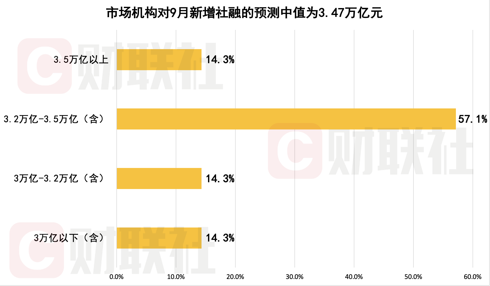 本期调查显示,市场机构对9月新增社融规模预测中值为3.47万亿元,较2024年同期3.76万亿元少增0.29万亿元,参与机构预测区间为3.08万亿至3.86万亿元。