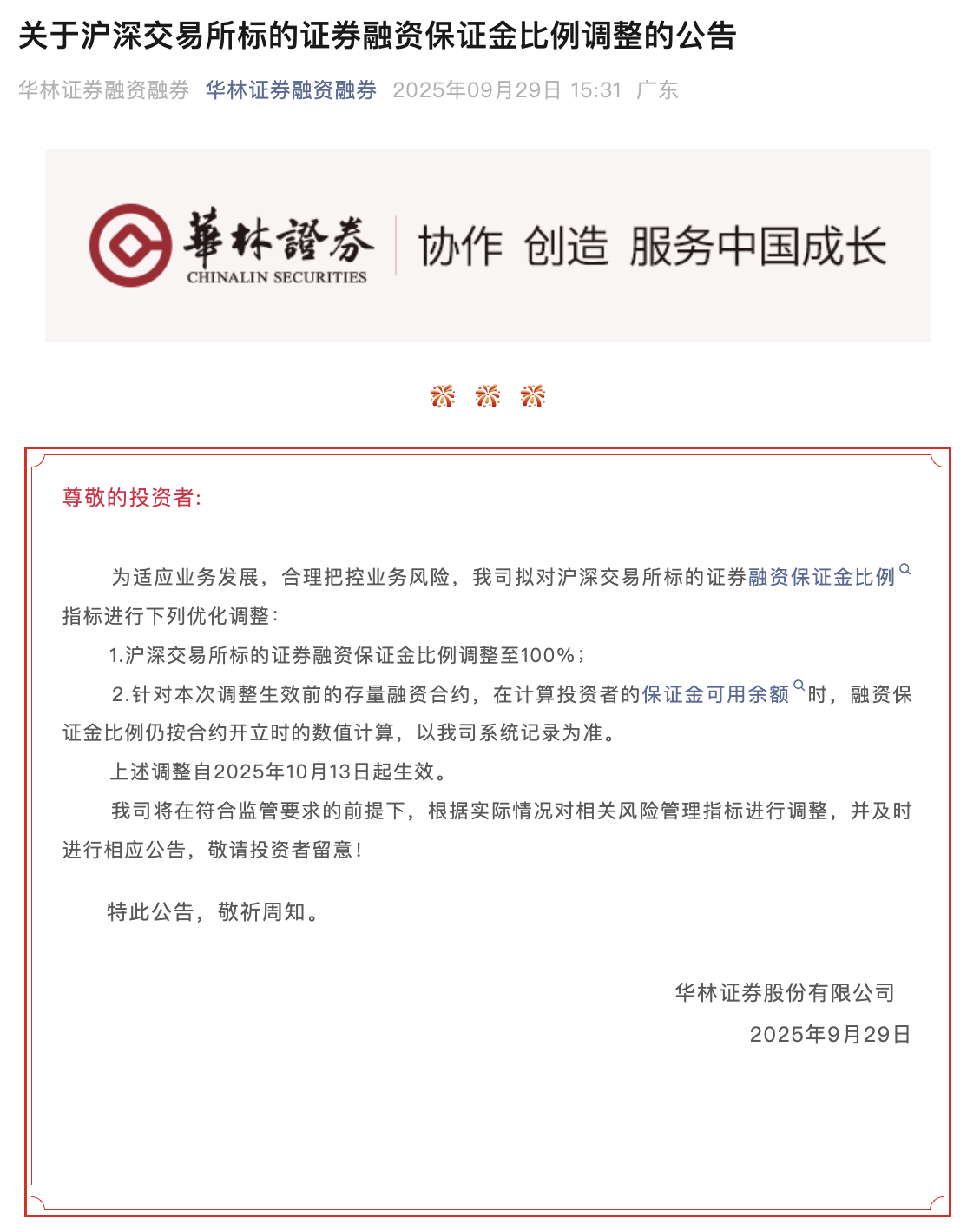 华林证券宣布自2025年10月13日起,将沪深交易所标的证券融资保证金比例调整至100%,旨在适应业务发展并合理把控风险,存量融资合约则仍按原比例计算。