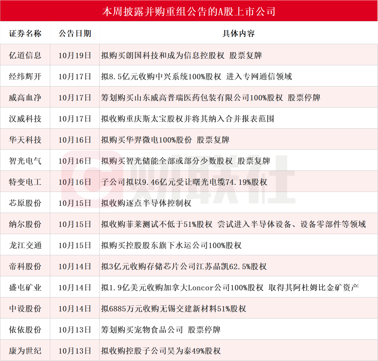 十余家A股上市公司本周披露并购重组最新公告 亿道信息拟购买朗国科技和成为信息控股权并于明日复牌