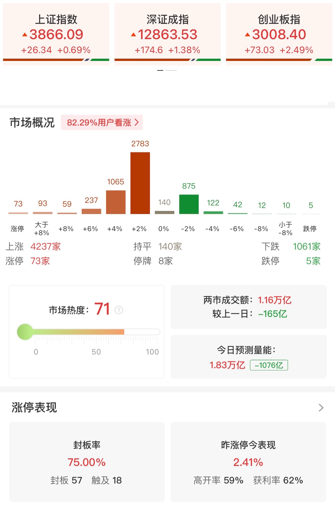 【午评:创业板指半日涨2.49% 煤炭、算力硬件股集体走强】财联社10月20日电,市场早盘高位震荡,创业板指领涨。沪深两市半日成交额1.16万亿,较上个交易日缩量165亿。盘面上热点轮番活跃,算力硬件股开盘后率先走强,“易中天”光模块三巨头领涨,剑桥科技等多股涨停。机器人概念表现活跃,三联锻造2连板,大洋电机、景兴纸业等多股涨停。芯片产业链再度走强,三孚股份4天3板,睿能科技3连板。煤炭板块延续强势,大有能源7天6板。下跌方面,贵金属方向集体下跌,湖南白银跌停。板块方面,煤炭、CPO、电池等板块涨幅居前,有色金属等板块跌幅居前。截至收盘,沪指涨0.69%,深成指涨1.38%,创业板指涨2.49%。