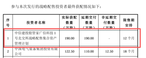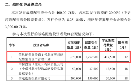 远不止这两个北交所新股项目。比如新股广信科技4000万战配额度,共10家机构拿到份额,高管、员工参与的“中信建投股管家广信科技1号”持股1900万,占初始发行比例接近10%;奥美森400万股战配额度,共16家机构成功拿到份额,公司发行人高级管理人员与核心员工参与的“信达证券奥美森1号”获配比例也为41.75%,接近初始发行规模10%的上限,为8.4%;北交所超小盘机器人电机概念股三协电机员工战配113万股,拿了约三成份额。