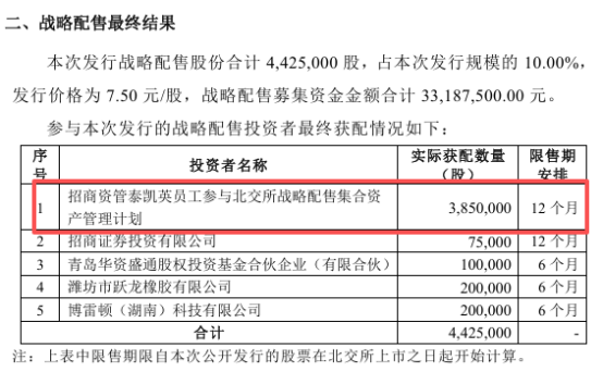 无独有偶,泰凯英也因高管、员工设立的资管计划获配占比过高引发争议。也就在最近泰凯英的发行中,同样是由招商资管发起的,面向公司员工的资管计划拿下385万股战配份额,占总战配量的87%,接近初始发行规模10%的上限。