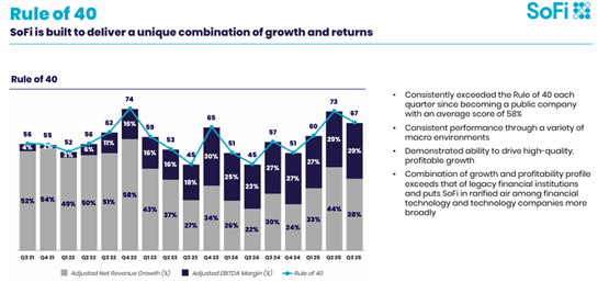 SoFi不仅维持着高速增长,还保持了极佳的营收效率与成本控制,连续多个季度达到“Rule of 40”(40法则),反映出公司在扩张期即具备盈利能力与运营弹性。