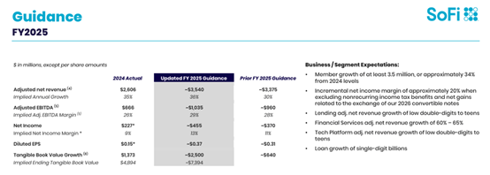 SoFi将2025财年调整后净营收指引提升至约35.4亿美元。调整后净利润预计约4.55亿美元。新增会员目标提高至至少350万,同比增长约34%。