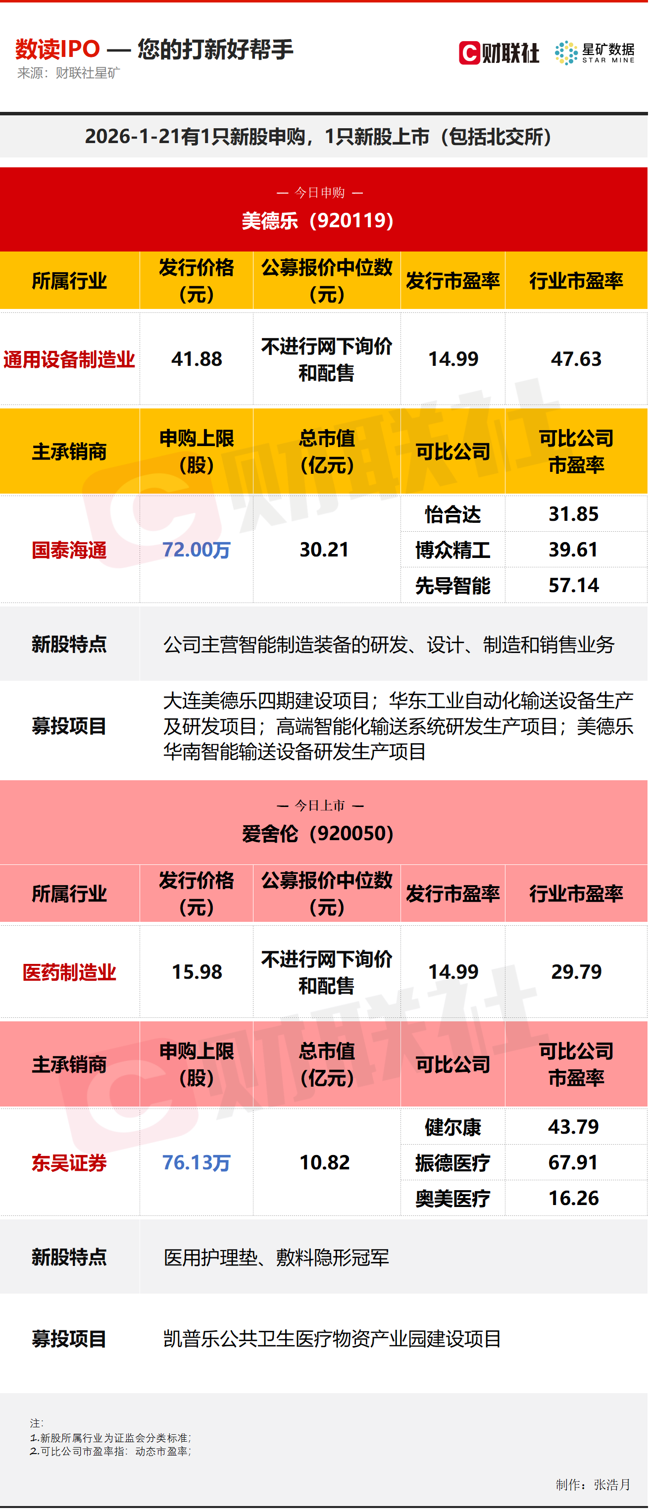 财联社1月21日讯,今日有1只新股申购,为北交所的美德乐;1只新股上市,为北交所的爱舍伦。
