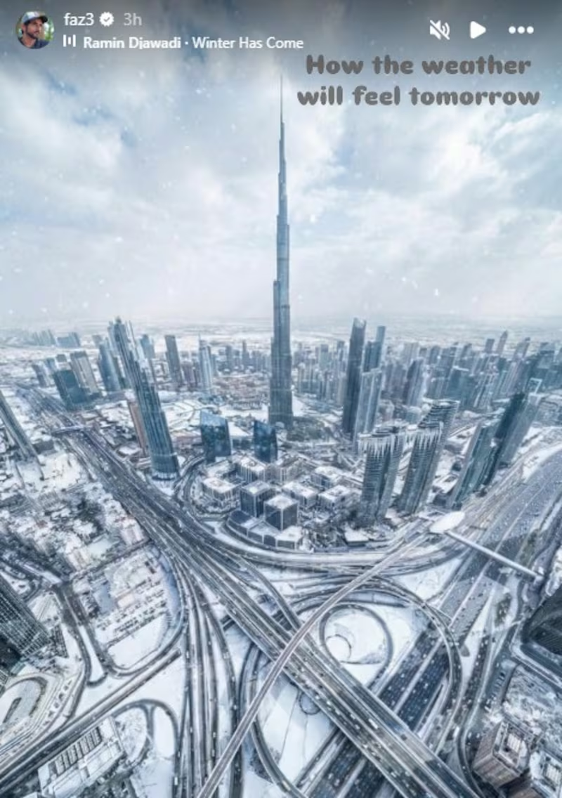 据当地媒体周四报道,近期迪拜王储、副总理兼国防部长哈姆丹·本·穆罕默德在他的社交账号上分享了一张被雪覆盖的迪拜城市照片,并配文说:“明天的天气会是什么感觉?”。