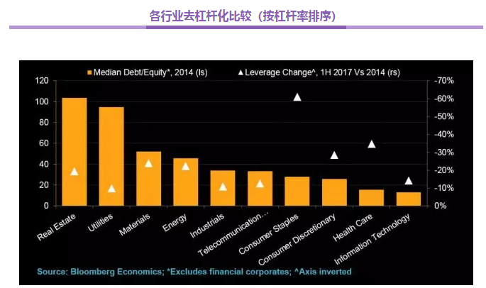 行业来看,企业杠杆主要集中于传统行业,这些行业的效率较低,负债增加带来的经济增长有限,“坏的”杠杆集中在公用事业、房地产、材料和能源行业。自2015年末启动去杠杆以来,这些行业上市公司的杠杆率中值下降10-20%。而另一方面,“好的”杠杆似乎出现在医疗保健、消费必需品和非必需消费品行业。相比上述“坏”杠杆行业,这些“好”杠杆行业同期的杠杆率中值下降速度更快,降幅达到30%甚至更高。