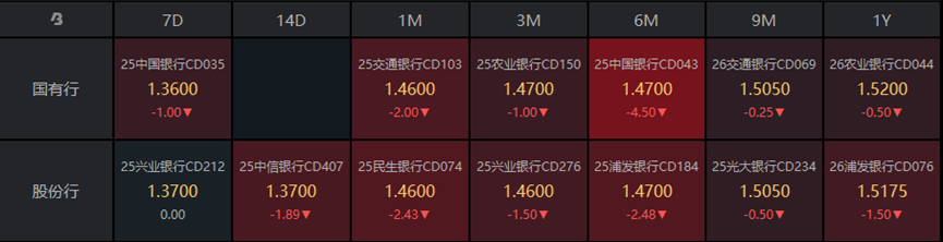 二级存单方面,3M国股成交在1.47%附近,较前一交易日下行1 bp,1Y国股成交在1.52%位置,较前一交易日下行0.5bp。
