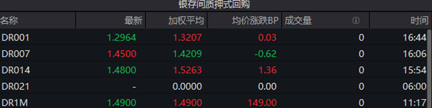 银行间回购定盘利率多数下跌。FR001跌1.0个基点报1.42%;FR007持平报1.49%;FR014跌1.0个基点报1.55%。