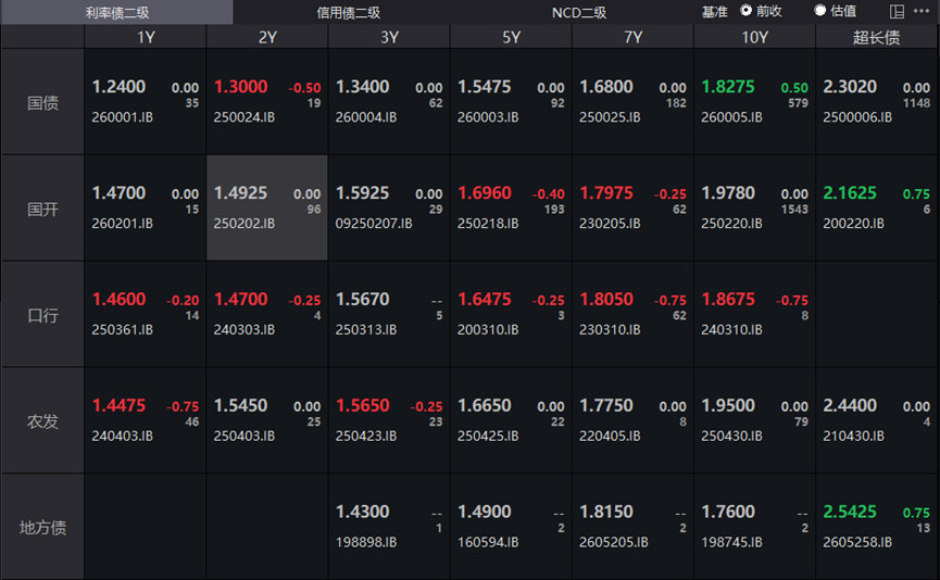 银行间主要利率债收益率窄幅波动,截至下午16:30,10年期国债活跃券260005收益率上行0.5bp报1.8275%,30年期国债活跃券2500006收益率持平报2.302%,10年期国开活跃券250220收益率持平报1.978%。