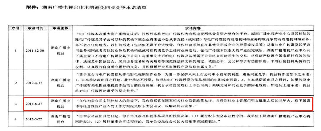 2014年6月27日,湖南广电承诺,“在作为贵公司实际控制人的前提下,我台将探索在国家相关行业监管政策允许、并得到行业主管部门明文批准之后的三年内,将下属媒体等经营性资产注入的工作方案提交股东大会审议,以解决同业竞争。”
