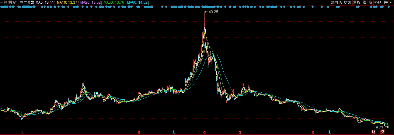 与此同时,2015年以来,电广传媒股价亦持续下跌,从5月27日的最高点43.25元/股下滑至目前的5.53元/股,跌幅高达85.93%。